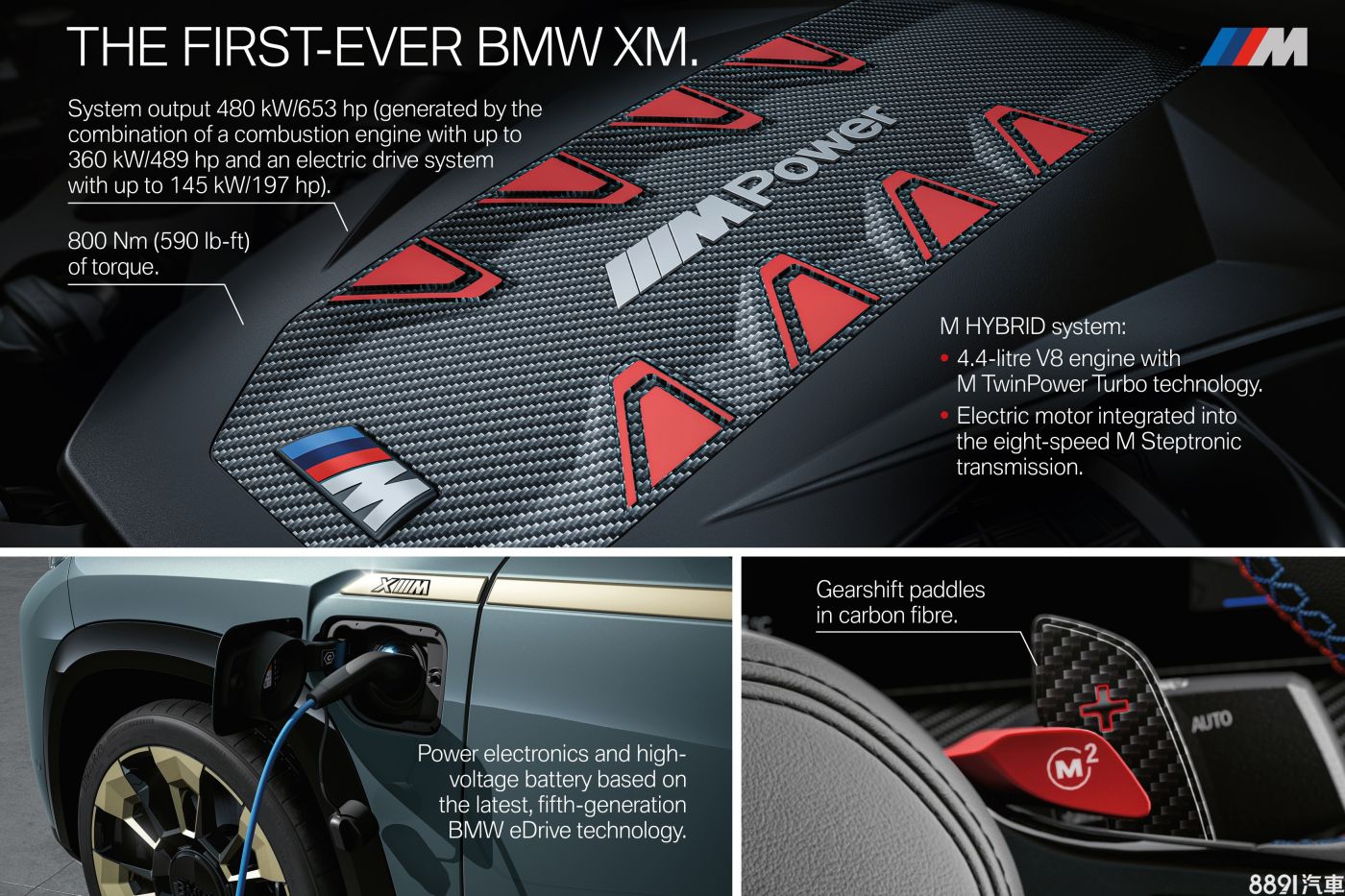XM是一款PHEV油電休旅,亦為首款撘載電動化動力的量產版M Power,引擎蓋下藏著一具489hp/66.3kgm的4.4升雙渦輪V8,撘配197hp/28.6kgm的單顆電動馬達,綜效輸出上看653hp/81.6kgm之譜。