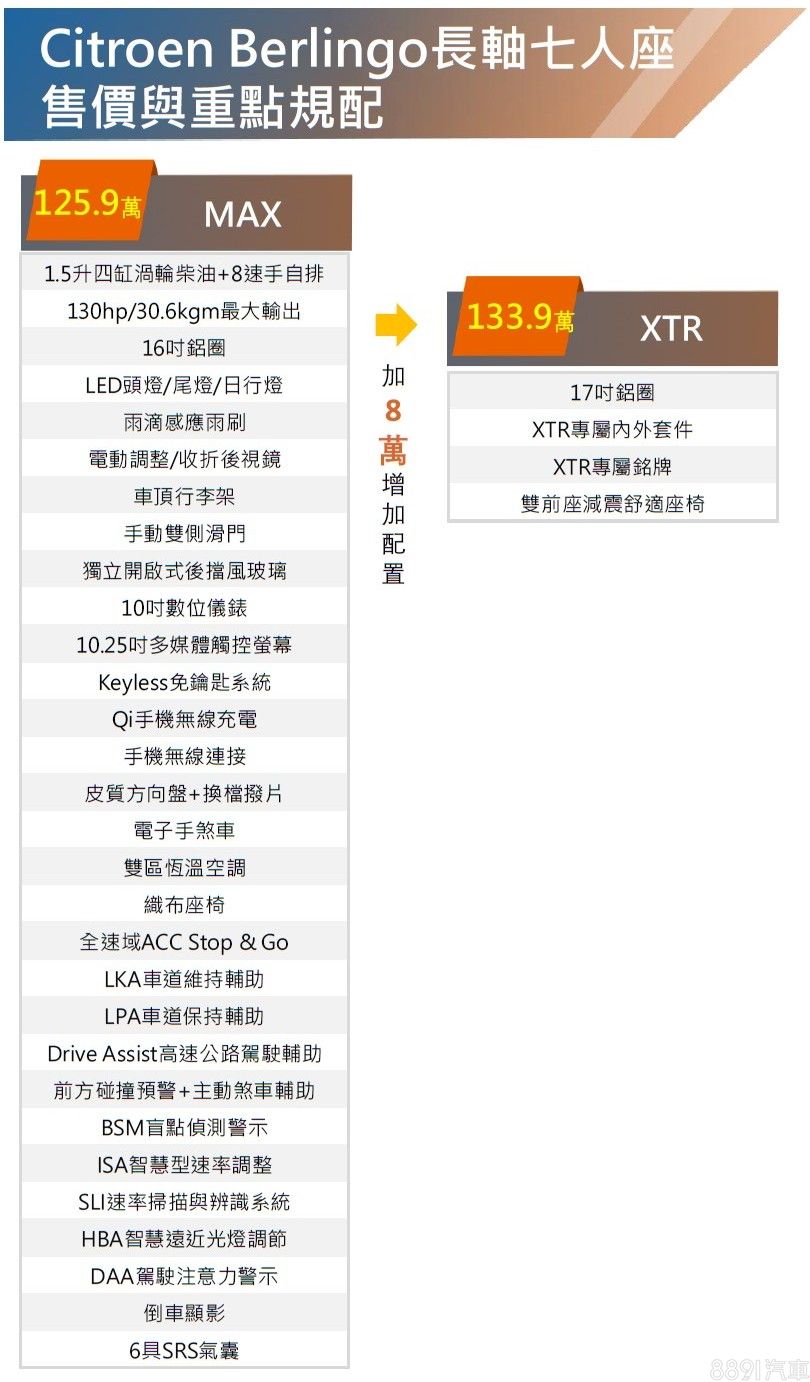 Berlingo長軸七人座提供MAX及XTR兩版本,入門車型的配備就很齊全,包含Level 2駕駛輔助、10吋數位儀錶、10.25吋觸控多媒體、Keyless、Qi手機無線充電、雙區恆溫皆列為標配,頂規XTR獨享專屬內外套件,主打個性化風格。