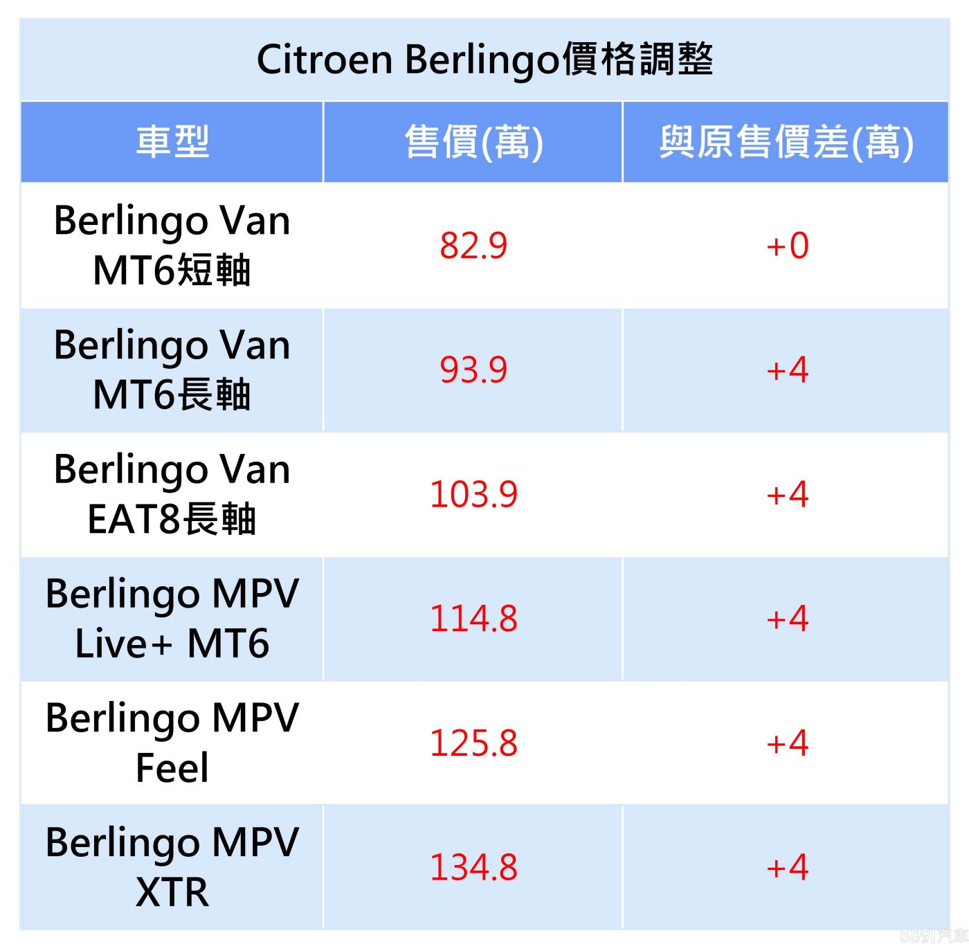 首先,Berlingo車系編成未調整,維持商用貨車與MPV各3車型,除了貨車入門版MT6短軸售價持平未,其餘車型均較先前上漲4萬。