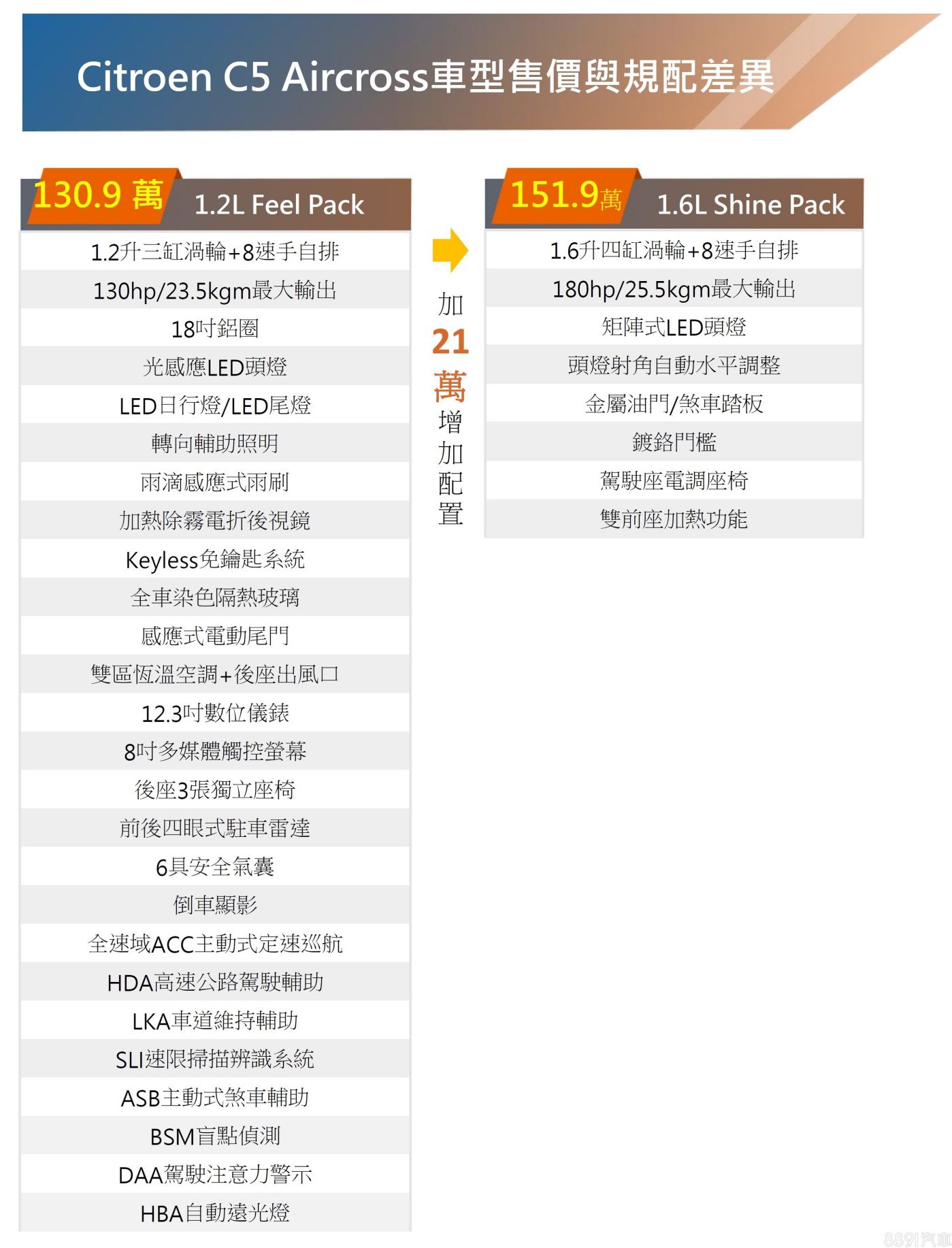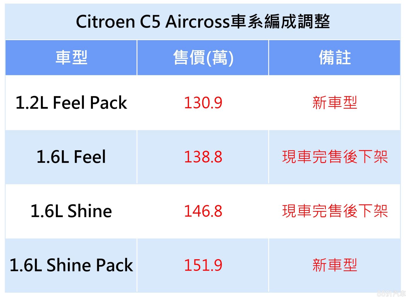 C5 Aircross則針對編成重新調整,目前規劃有4車型,不過據了解中階的1.6L Feel與Shine兩車型,庫存完售後就會下架,未來就會僅剩2車型編成,由新增的1.2升三缸渦輪引擎擔綱入門動力,具備130hp/23.5kgm最大輸出,高規版則為現售1.6升四缸渦輪引擎,出力180hp/25.5kgm,變速箱均搭8速手自排。