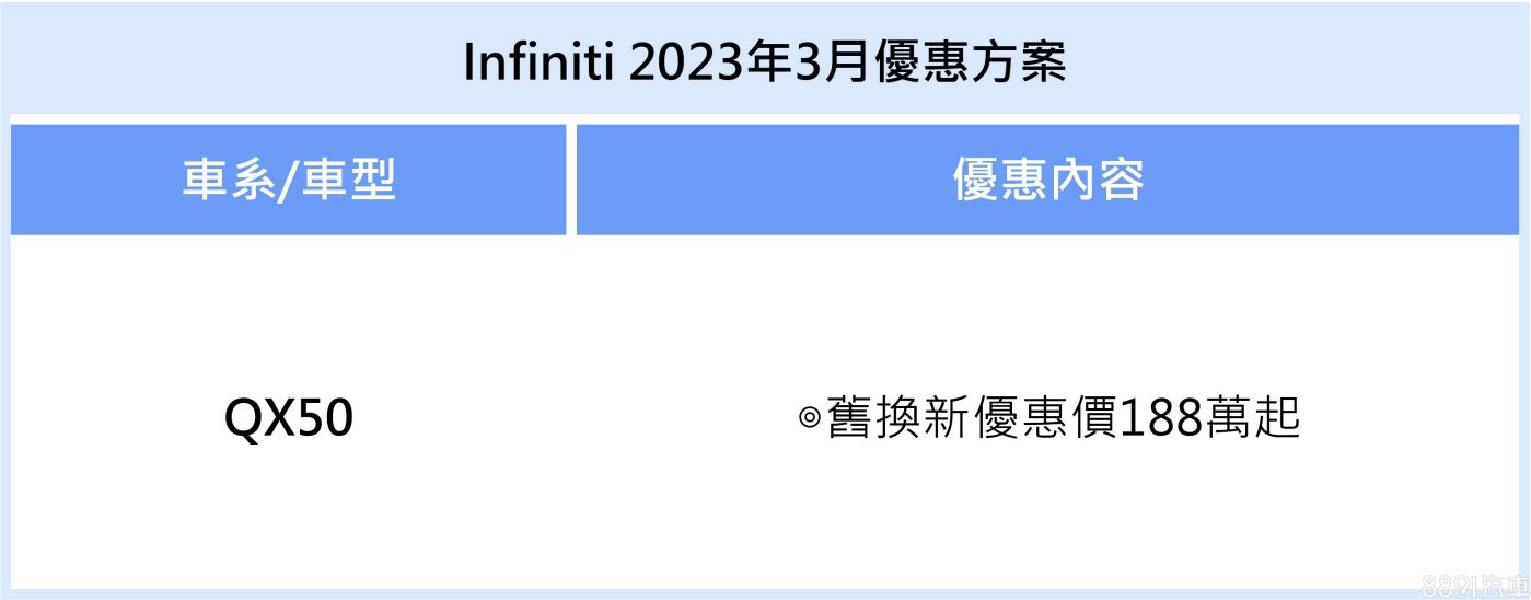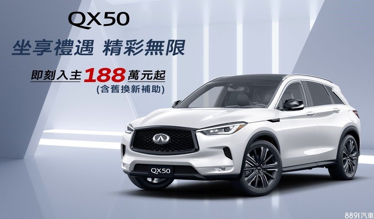 Infiniti本月針對QX50祭出購車優惠,月底前入主即可享有舊換新優惠價188萬,等同直接折價20萬。
