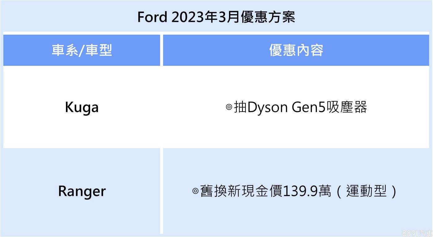 福特六和本月針對Kuga、Ranger推出購車優惠,月底前入主Kuga即可抽Dyson Gen5無線吸塵器(價值28900元),Ranger指定車型則享有舊換新現金優惠價。
