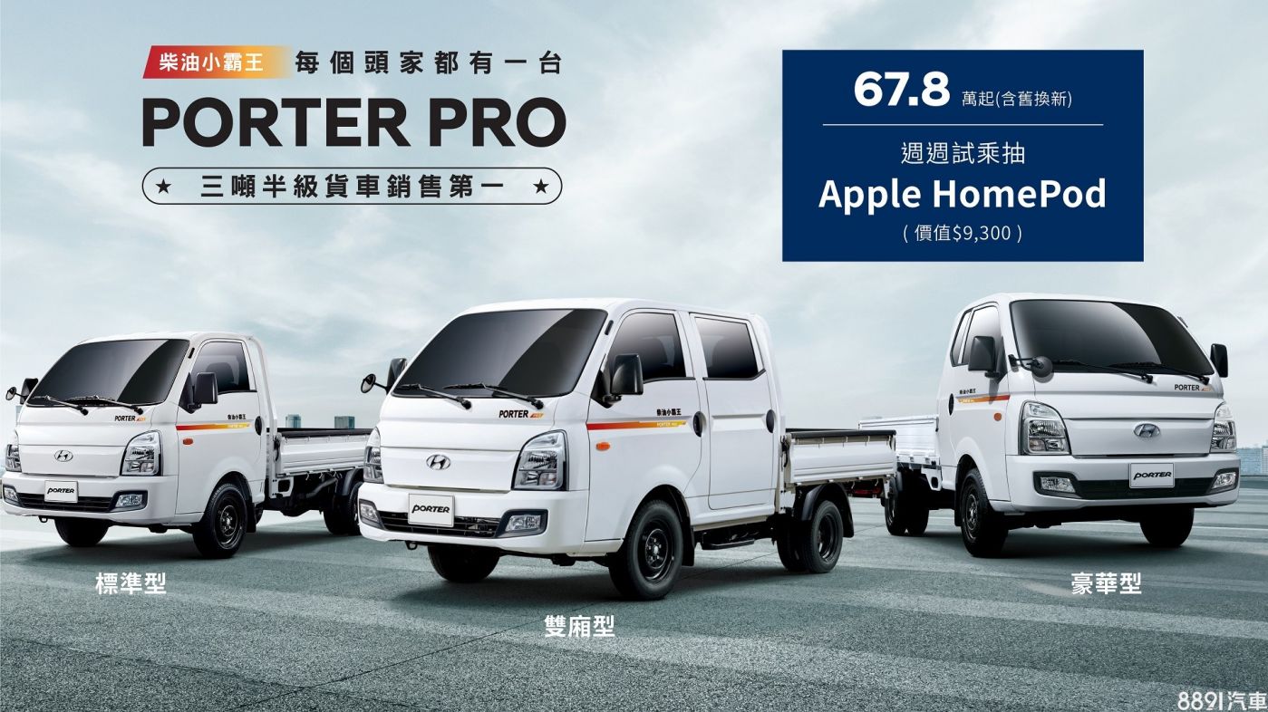 南陽現代本月試乘可抽價值9300元的Apple HomePod,入主Porter車系再送萬元購車金、BSD盲區偵測系統及E-View電子後視鏡。