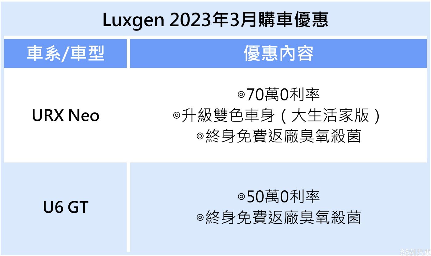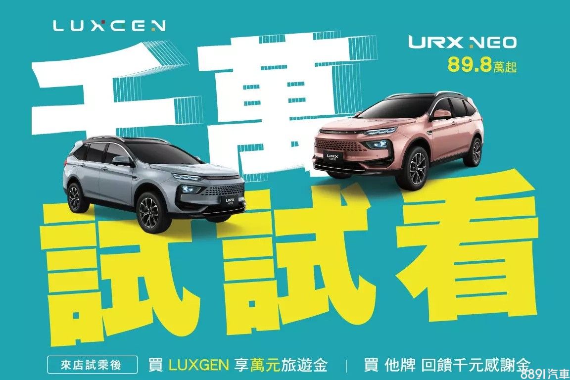 納智捷本月針對全車系推出「千萬,試試看!」試乘活動,預約試乘當月購車即享高分期零利率,再加碼1萬元旅遊金,購買他牌亦有1千元感謝金。入主URX Neo除可享70萬分期零利率外,大生活家版可再免費升級Two-Tone歐風雙彩車色,U6 GT則享50萬分期零利率。