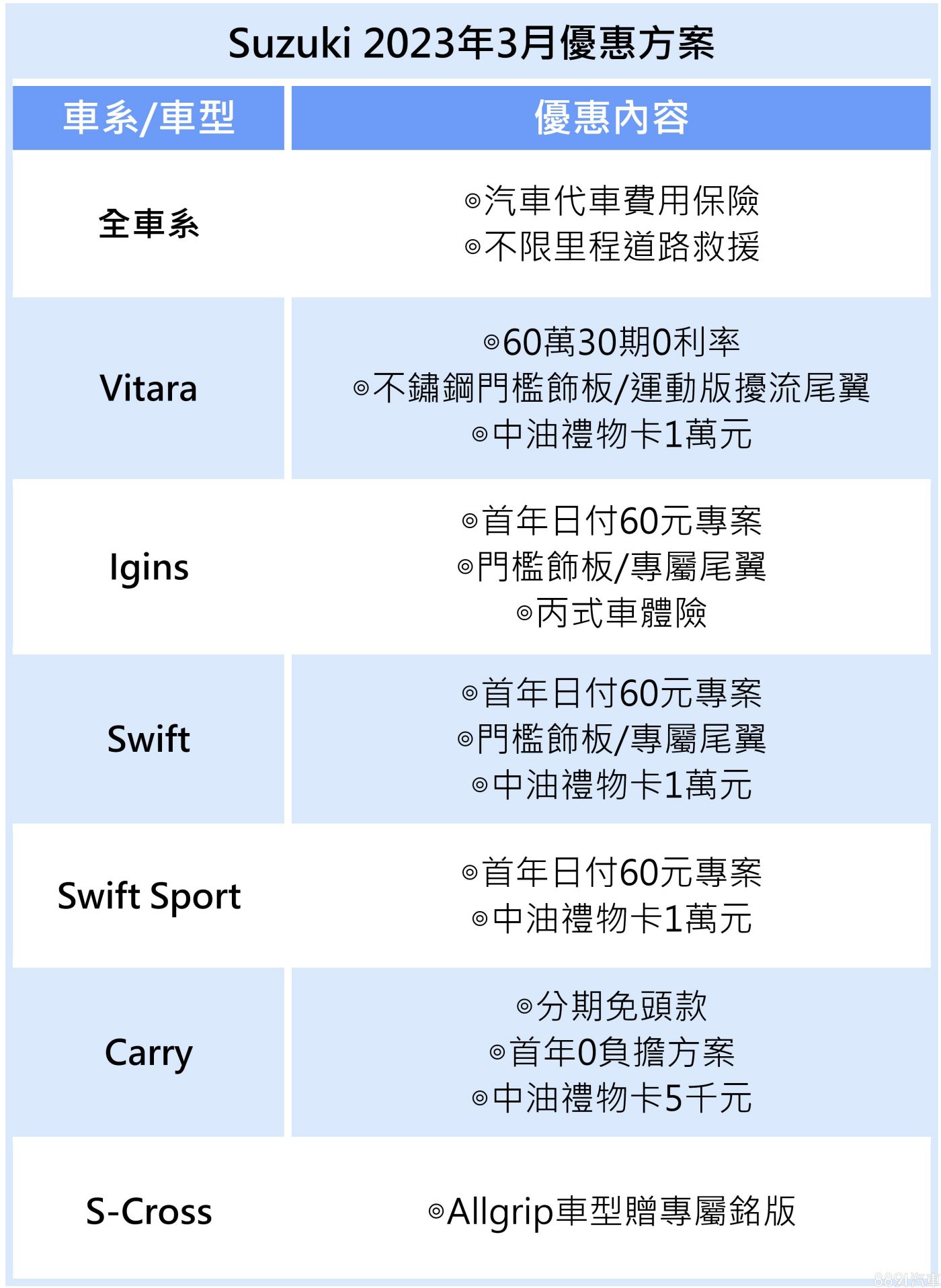 金鈴鈴木汽車本月全車系領牌,可享有汽車代車費用保險與不限里程道路救援服務,各車系另有專屬購車優惠,指定車款再送中油禮物卡或原廠配件禮。