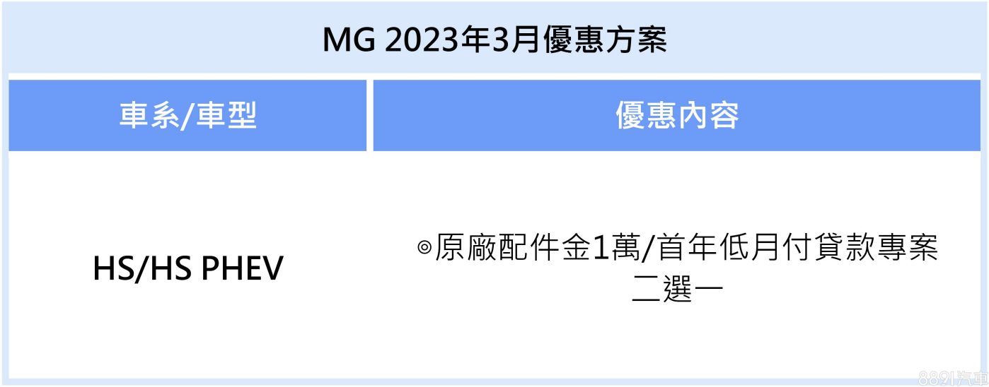 MG本月持續針對旗下HS及HS PHEV祭出輕鬆入主方案,購車即可享原廠配件金1萬元或首年低月付貸款專案二選一。