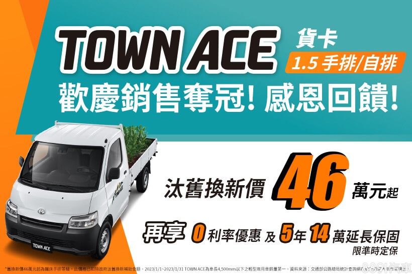 和泰豐田汽車本月針對全車系推出各式分期優惠,Town Ace貨卡版再享5年14萬公里延長保固。