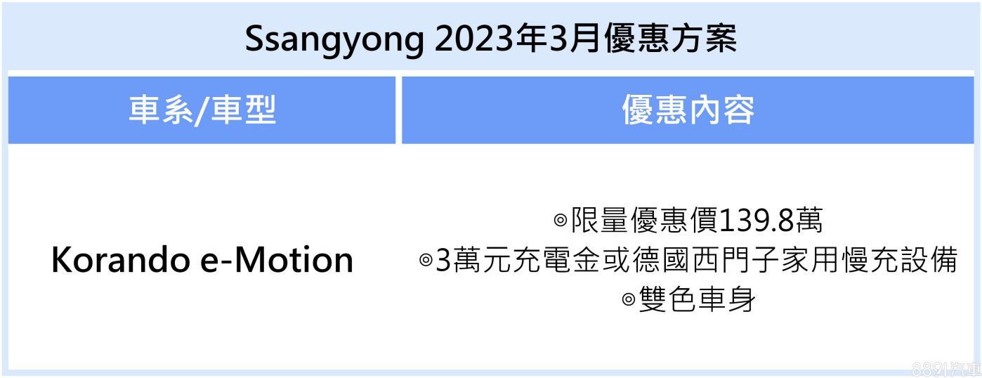 永嘉雙龍汽車本月針對新上市的電動車Korando e-Motion推出早鳥優惠,月底前入手可享優惠價139.8萬(原價148萬),另外還有雙色車身、家用慢充設備或充電金等專屬禮。
