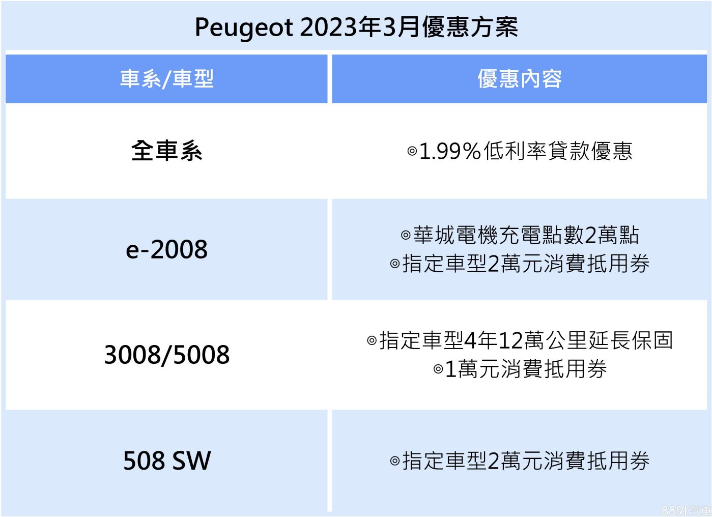 Peugeot總代理寶嘉聯合本月針對3008、5008指定車型,推出4年12萬公里延長保固,電動車e-2008則是贈送2萬點充電點數,全車系同享低利率貸款優惠。