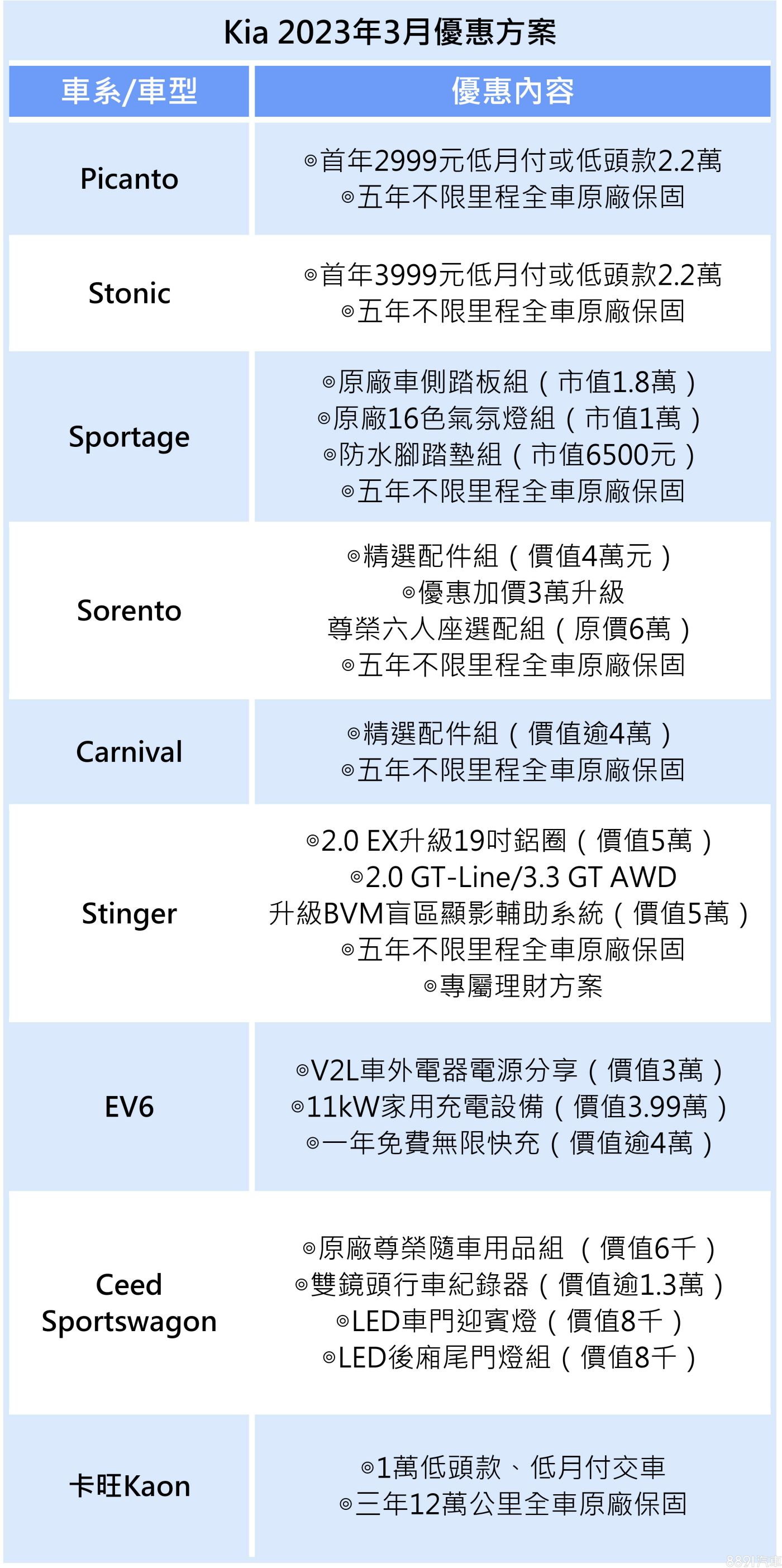 台灣森那美起亞本月繼續為全車系推出專屬優惠,入主Sorento可享價值4萬之精選配件組,或優惠加價3萬升等尊榮6人座選配組(原價6萬),EV6則享有總價逾10萬的電動車禮遇,新上市的Ceed Sportswagon也有總價逾3.5萬的專屬禮遇。