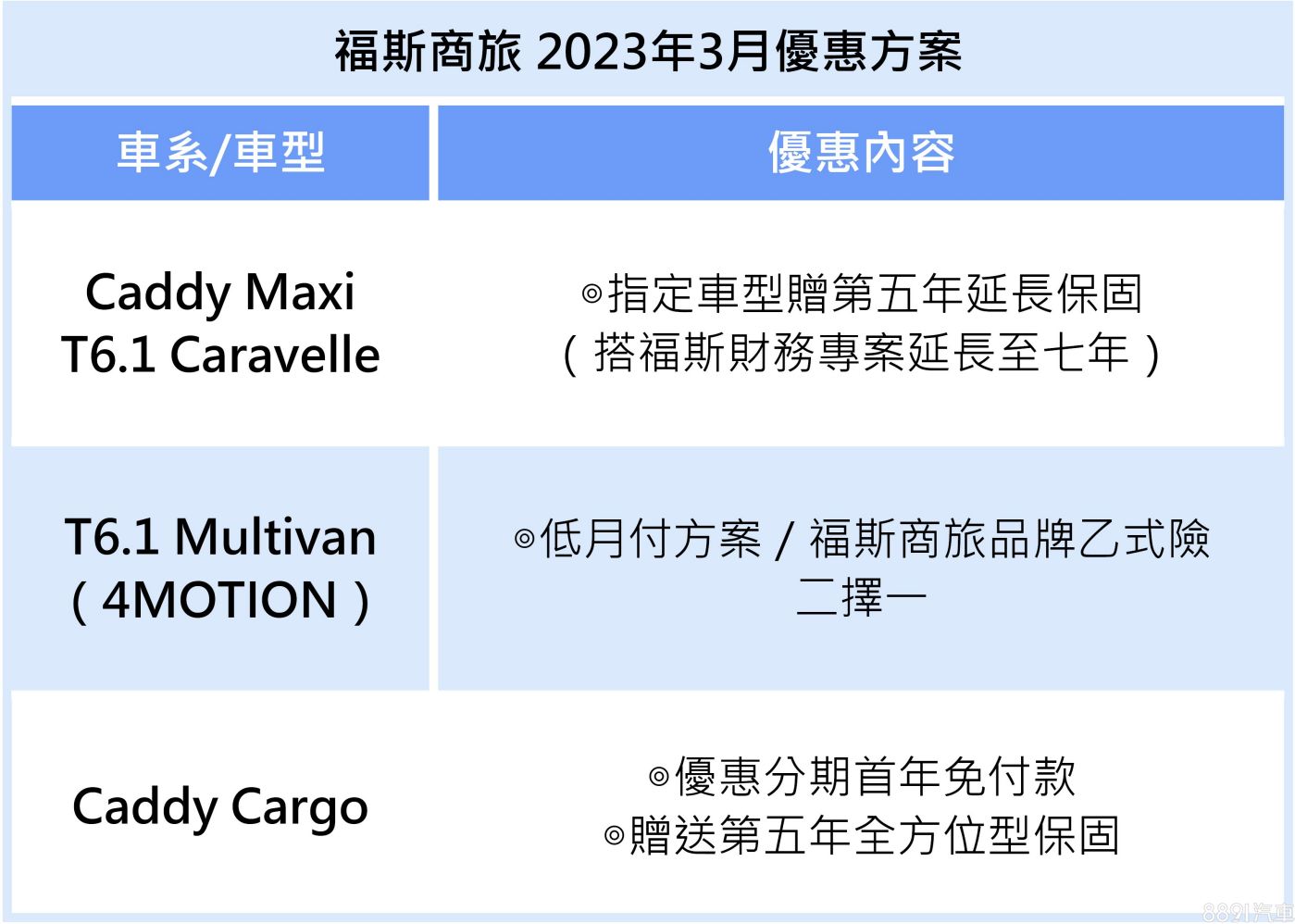 台灣福斯商旅本月持續針對旗下多車系,提供高額分期低利率方案,指定車型贈送第五年全方位防護型保固、福斯商旅品牌乙式險,Caddy貨車版則有分期首年免付款優惠。