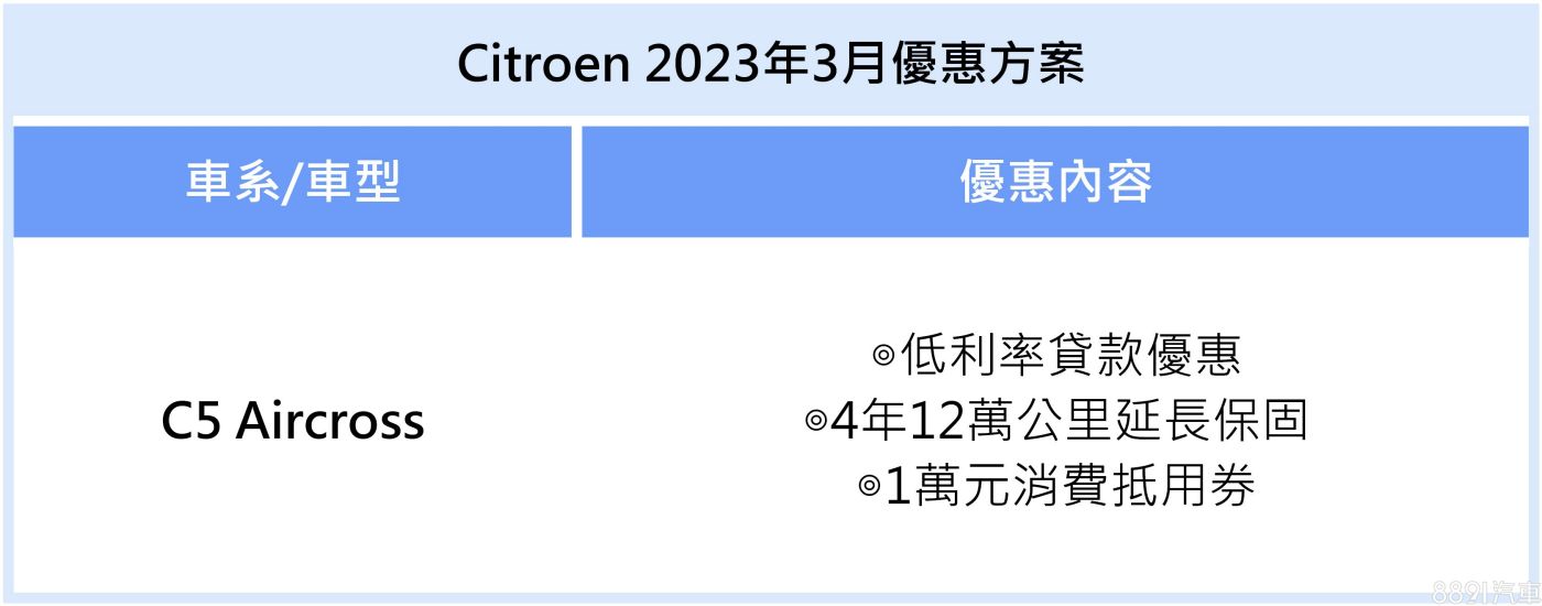 寶嘉雪鐵龍本月針對C5 Aircross推出低利率貸款優惠,指定車型享4年12萬公里延長保固,再加贈1萬元消費抵用券。