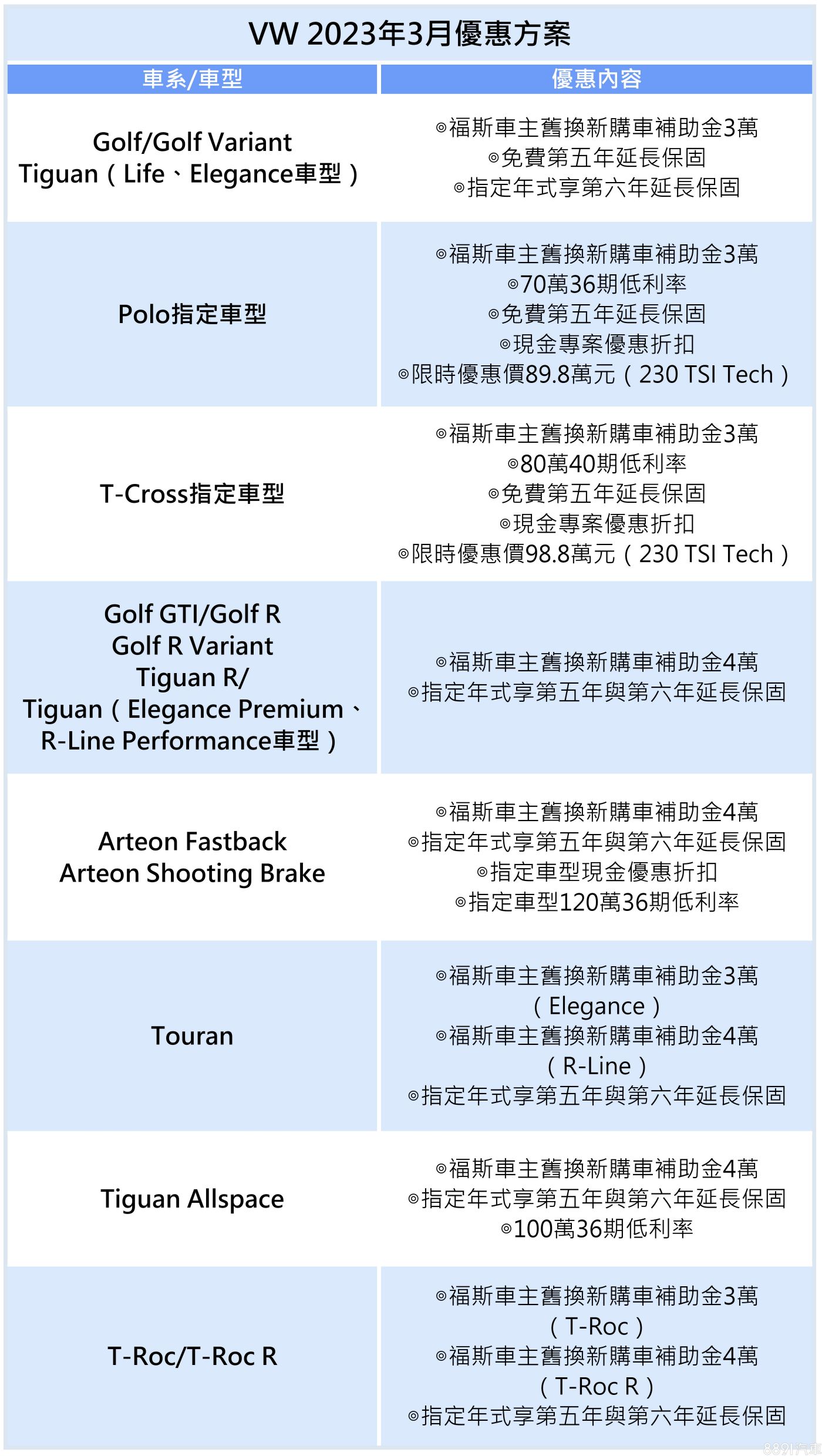 台灣福斯汽車本月針對多款車型推出低利率、免費第5、6年延長保固等方案,全車系也提供福斯舊車主汰舊換新補助金優惠,部分車型再享限時優惠價。