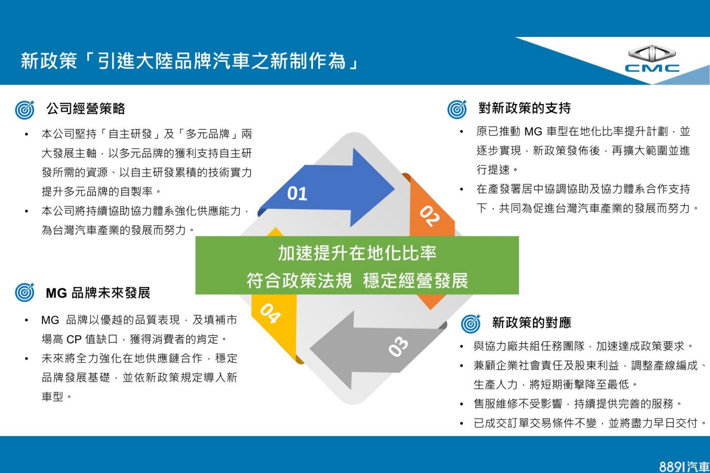 原廠對新政策表示支持,並透露MG原本就有強化在地供應鏈的規劃,未來將加速實現並逐步滿足自製率要求,現階段則暫時調整產線編成和生產人力,以因應新制造成的衝擊,後續將為回復正常銷售與交付來努力。