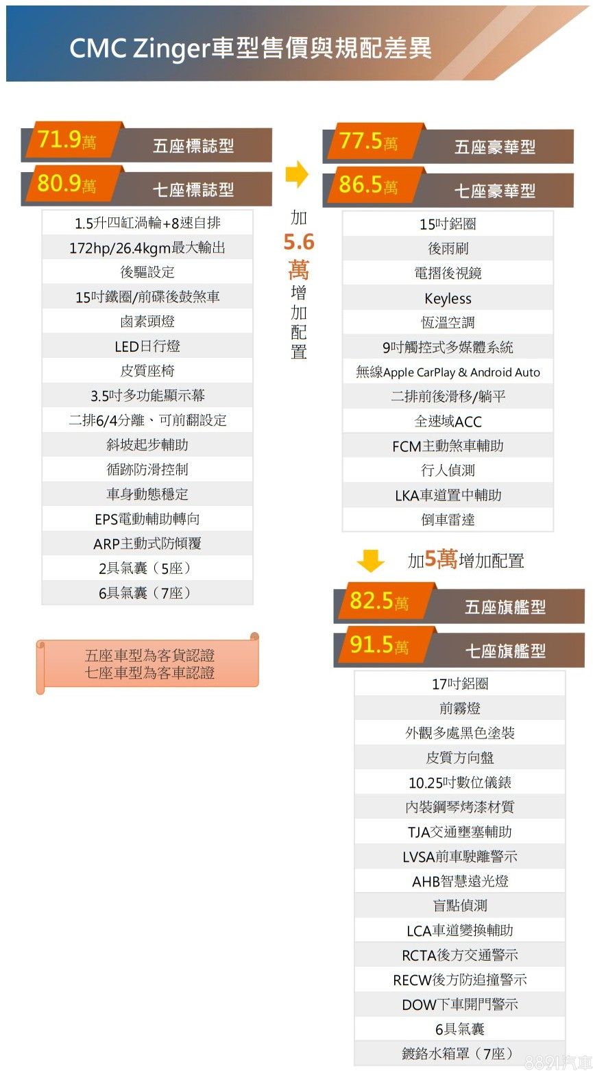 大改款Zinger正式上市維持3款五人座、3款七人座,共計6款車型,與預售價相比,標誌型與豪華型皆降價1萬元,旗艦型則降1.4萬元。從配備堆疊來看,中階以上標配全速域ACC、LKA車道置中,旗艦款更多出TJA交通雍塞輔助,於60km/h以下也有車道維持功能,主動安全配備豐富度堪稱商車之最!至於入門款同樣有全新動力,但配備面精簡許多,用71.9萬元來照顧純商用族群。