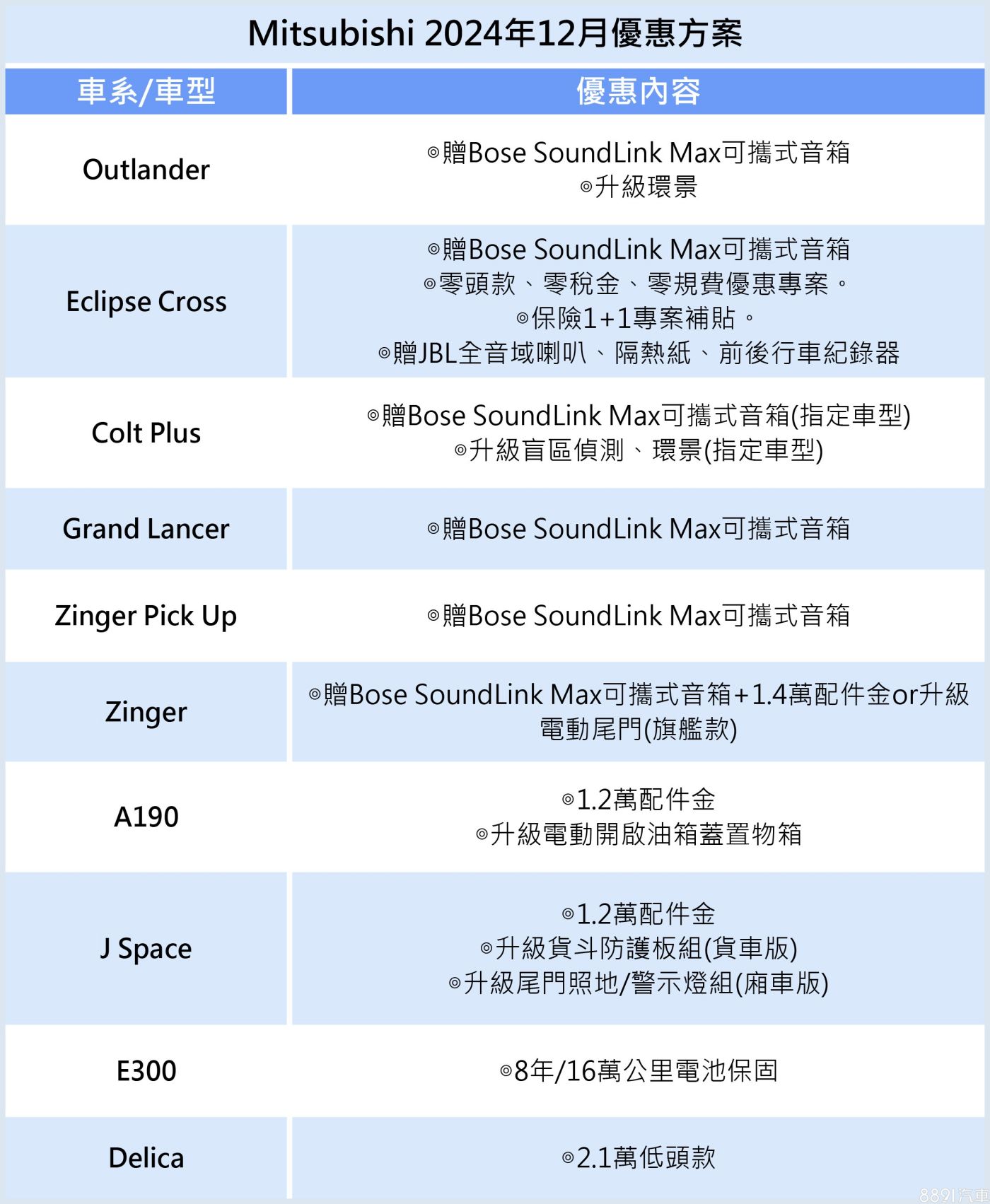 凡購買Outlander、Eclipse Cross、Colt Plus、Grand Lancer、Zinger Pick Up與Zinger指定車型並完成領牌,均贈Bose SoundLink Max可攜式音箱。