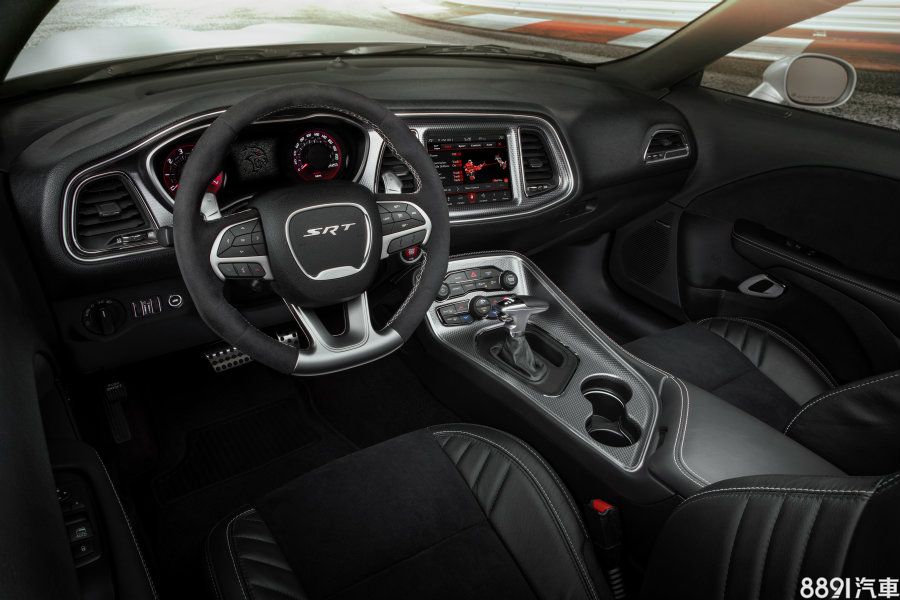 內裝風格與新款Hellcat陣容接近,配備中央8.4吋觸控多媒體螢幕及碳纖維飾板,但另採用紅色安全帶強化運動氛圍。儀表仍採傳統類比式,但時速表末速增加至220mph(約354km/h),儀表中央資訊顯示幕圖示也改以專屬的紅眼地獄貓。