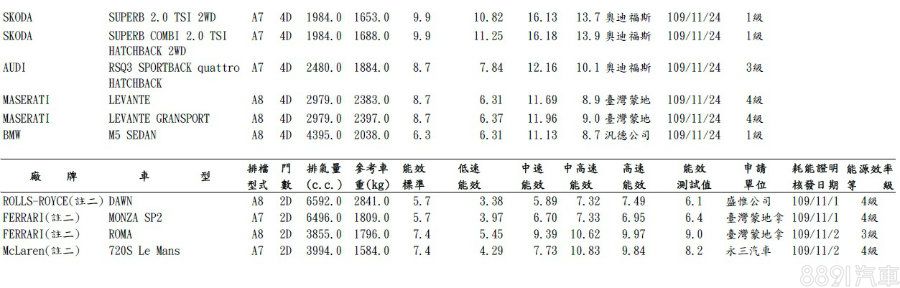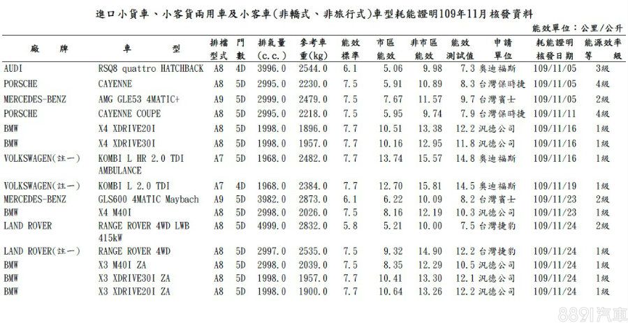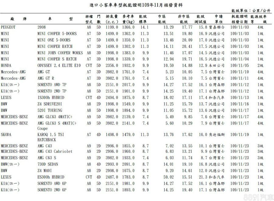 國產車方面,除了已發表的新年式Toyota Sienta七座1.8升動力車型,還有備受關注的Ford Focus Active,名單中受測的有2車型,搭載1.5升渦輪引擎,繳出16.4km/L的一級能效成績。