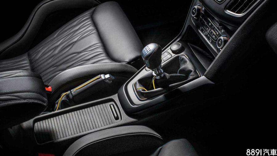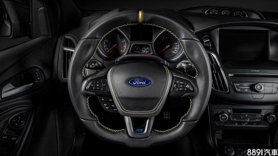 Carlex Design於Focus RS車室採用大量真皮材質包覆,包含自家出品的方向盤、排檔座、座椅、車門飾板、前座中央扶手等處,並施以水波紋路設計,加上白色車縫線、黃色飾條,打造出極具張力且兼顧質感的視覺效果。