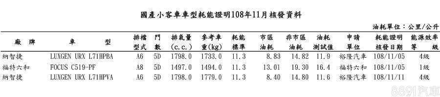 除了甫於本周(12/16)發表的URX車系七人座版本再次出現外(七人款為客車認證,五座均客貨車認證),還有一款Focus,不過僅能得知其平均油耗為16.4km/L,看不出究竟為何車型,但車重較先前送測的Focus都更多些,不排除為先前我們報導過,可望為配置多連桿懸吊的Focus,新車預計會在2020台北車展正式和消費者見面。