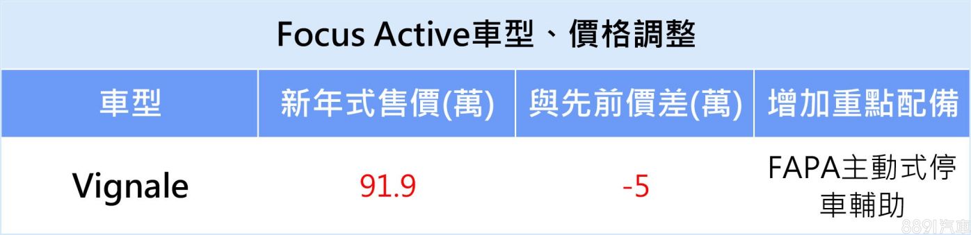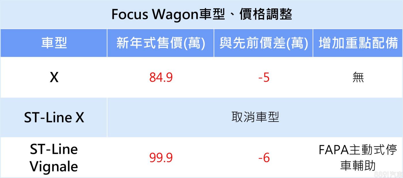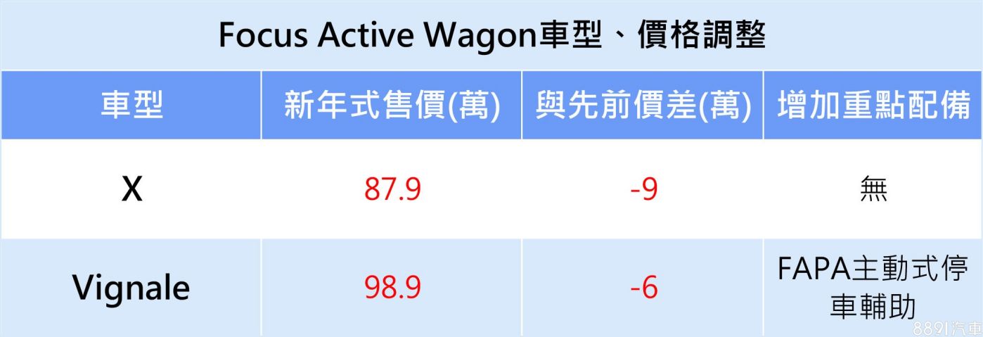 旅行車方面,Focus Wagon砍掉原中階版,規劃「X」及「ST-Line Vignale」兩等級,各自調降5萬與6萬;Focus Active Wagon續供「X」及「Vignale」兩車型,其中入門款一口氣降價9萬,為車系最高降幅。