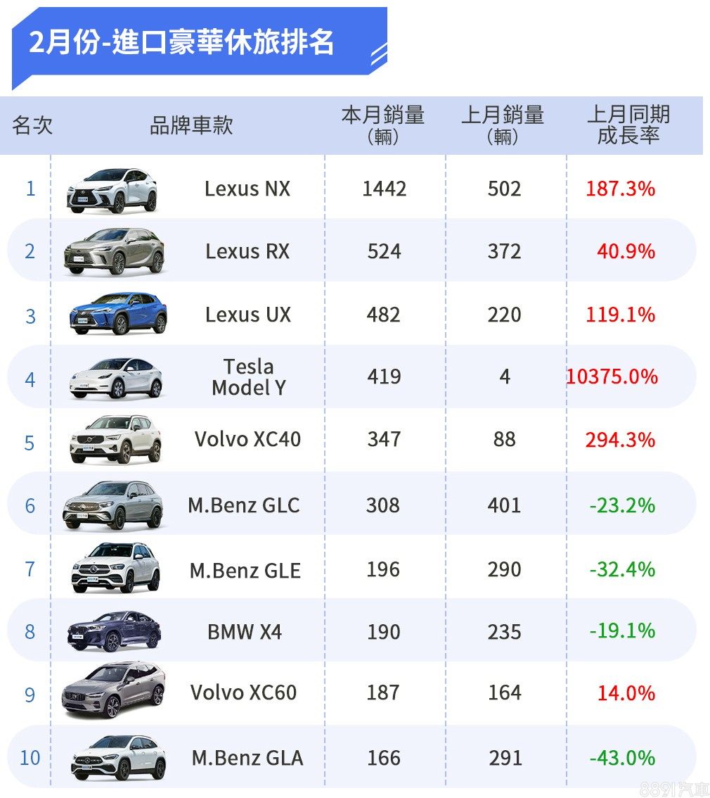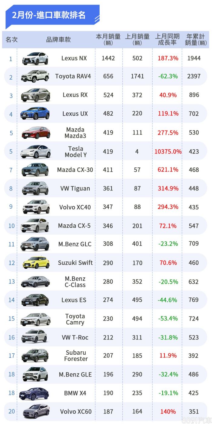 2月份進口車款Top 20 Lexus大軍表現強勢