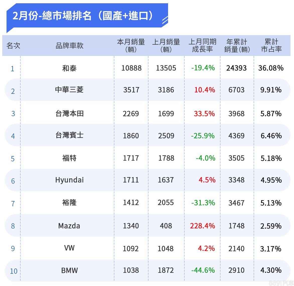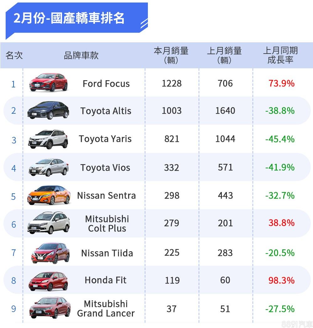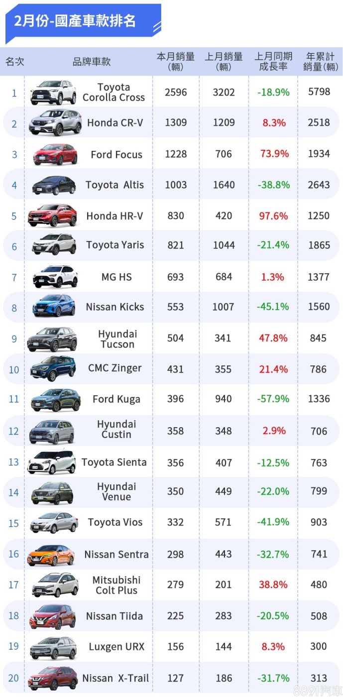 2月份國產車款Top 20 龍頭豐田跌幅頗大