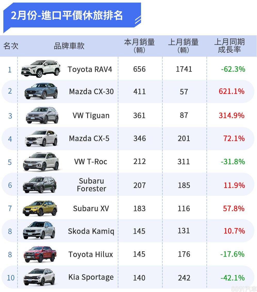 2月份進口平價休旅Top 10