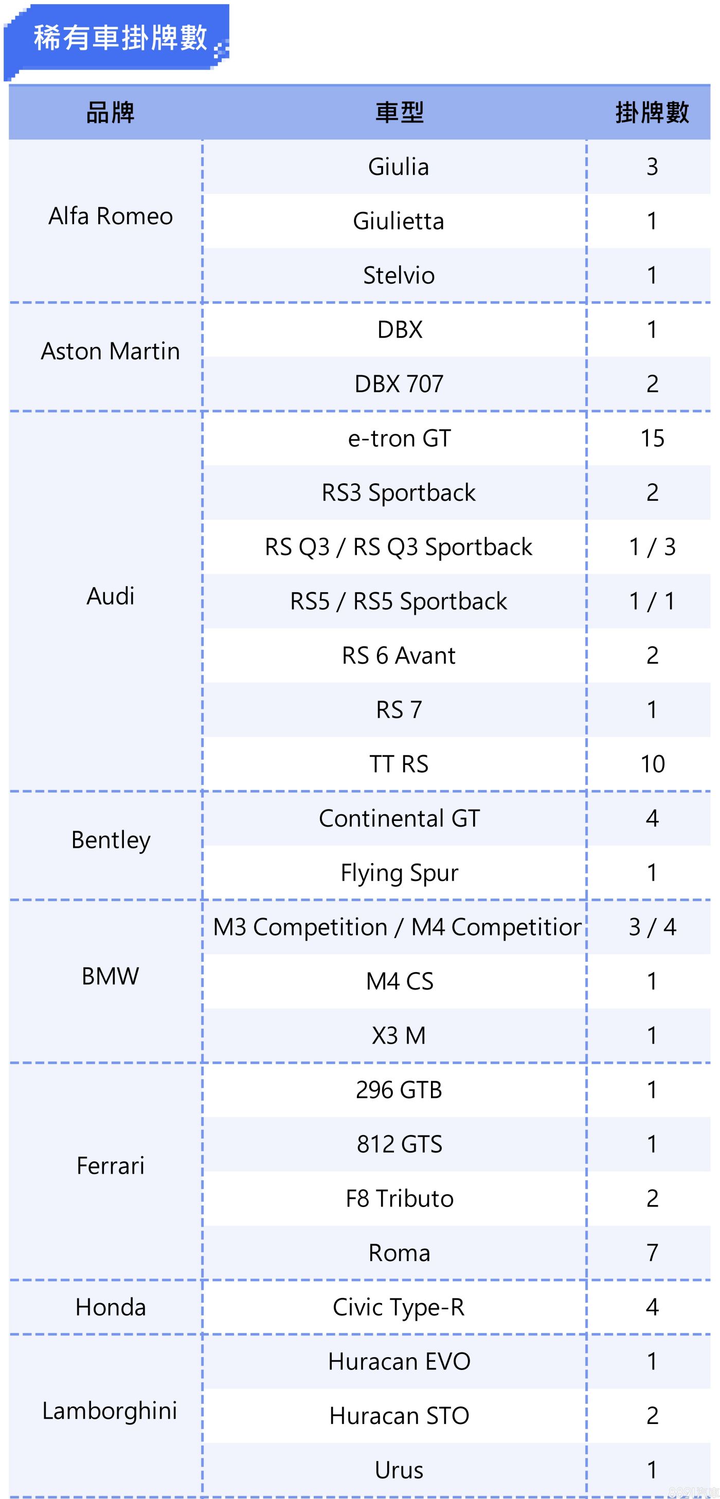 藍寶堅尼則是有2輛要價1990萬起的「道路版賽車」Huracan STO,不過品牌最熱銷的Urus就僅有1輛掛牌紀錄,相比過去幾乎都是5~10輛的水準,本月顯得有些「冷清」。
