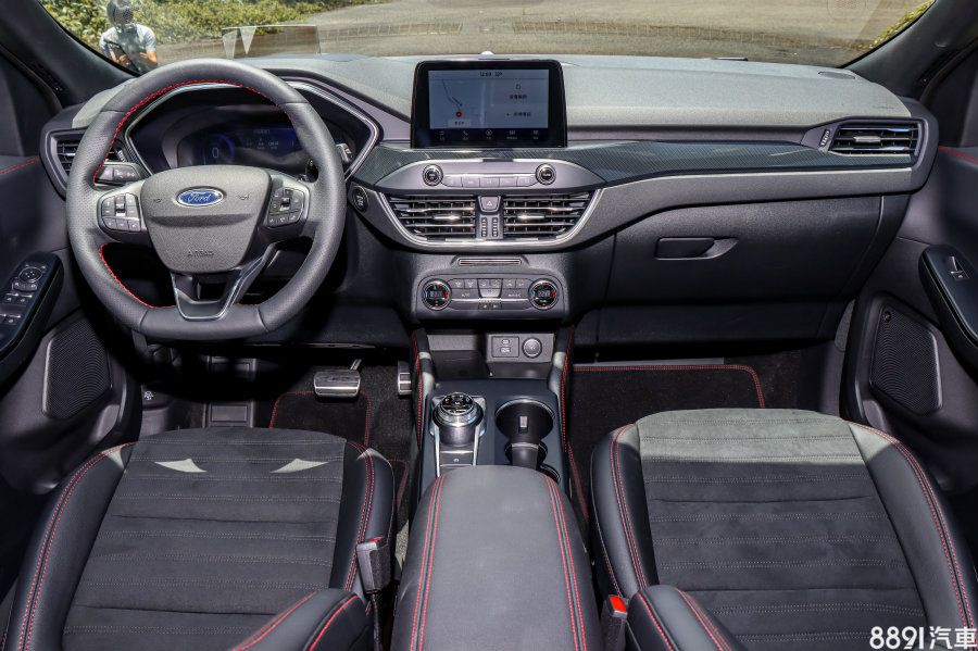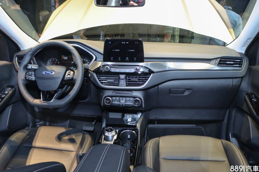 新Kuga內裝也與Focus高度相似,但與舊款相比簡約許多,減少50%的實體按鍵數量,整個中控台位置前移,視覺壓迫感也沒那麼重。材質維持大量軟質塑膠設定,透過壓花處理淡化內裝塑料感,比較特別的是跑車平底式方向盤列為全車系標配(ST-Line多換檔撥片)。