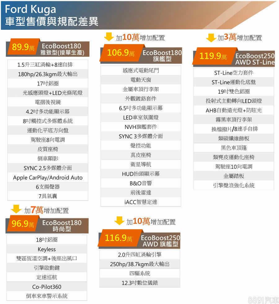 新Kuga取消柴油動力,採EcoBoost 180及EcoBoost 250 AWD兩款汽油渦輪動力選擇,前者搭載1.5升三缸引擎及前驅配置,分為接單生產的雅致型(89.9萬)、常駐販售的時尚型(96.9萬)與旗艦型(106.9萬);後者換上2.0升四缸引擎及四驅設定,除了116.9萬的旗艦型,還有造型更動感的頂規ST-Line,售價119.9萬。