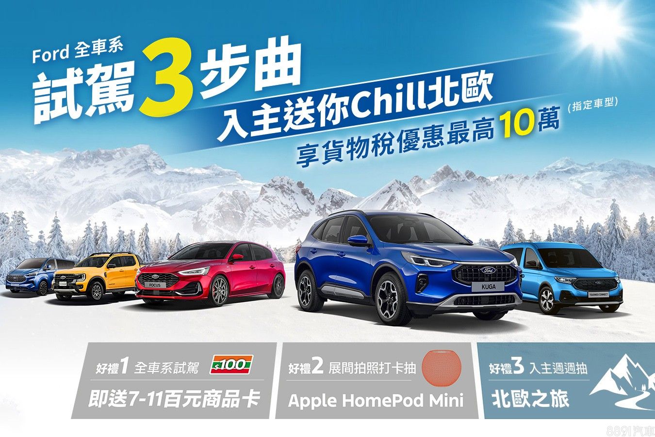 Ranger Wildtrak也限時推出感恩回饋價154.8萬(含舊換新),等於現折5萬,再享百萬0利率;此外,至全台Ford展示中心試駕任一車款,即可獲得7-11百元禮物卡,入主週週抽北歐之旅來回機票,於展示間拍照打卡上傳Ford(TW)官方臉書粉絲團指定貼文,再抽Apple HomePod Mini。