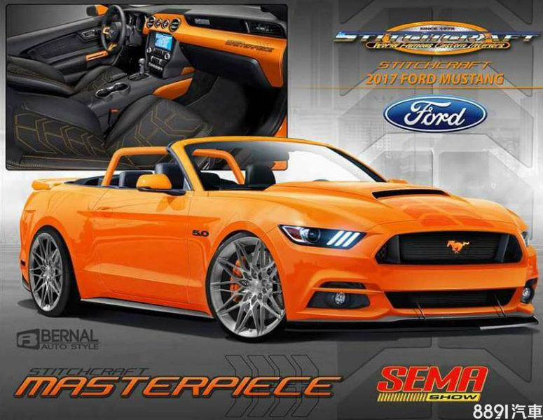第二款則是針對Mustang Convertible下手進行改裝,將拉低的車身施以糖果橘色塗裝,換上新式樣的水箱護罩與進氣壩柵格,引擎蓋上則予以大型散熱孔設計,並配置碳纖維車身套件,包含引擎蓋、前下擾流、側裙、尾翼等多處,搭配20吋鋁圈,與前255/35/R20、後275/35/R20的Falken Azenis FK453跑胎。動力部分雖無更動,一樣搭載2.3升EcoBoost渦輪應壓汽油引擎,及6速自排變速箱,可產生315hp/44.3kgm之最大輸出,但特別安裝了氮氣加速系統,使車輛能在瞬間爆發出強大的動力,短時間地提高行駛速度。而為了應付這種在瞬間迸出的強大爆發力,也特別改搭載RideTech的懸吊系統,並配置Wilwood打孔碟盤與前6、後4活塞剎車卡鉗。除了外觀予以亮眼的橘色塗裝和碳纖維空力套件之外,車室內部也配置與車身同色的亮橘飾板、以橘色車縫線點綴的Katzkin真皮座椅、及Alpine音響系統。