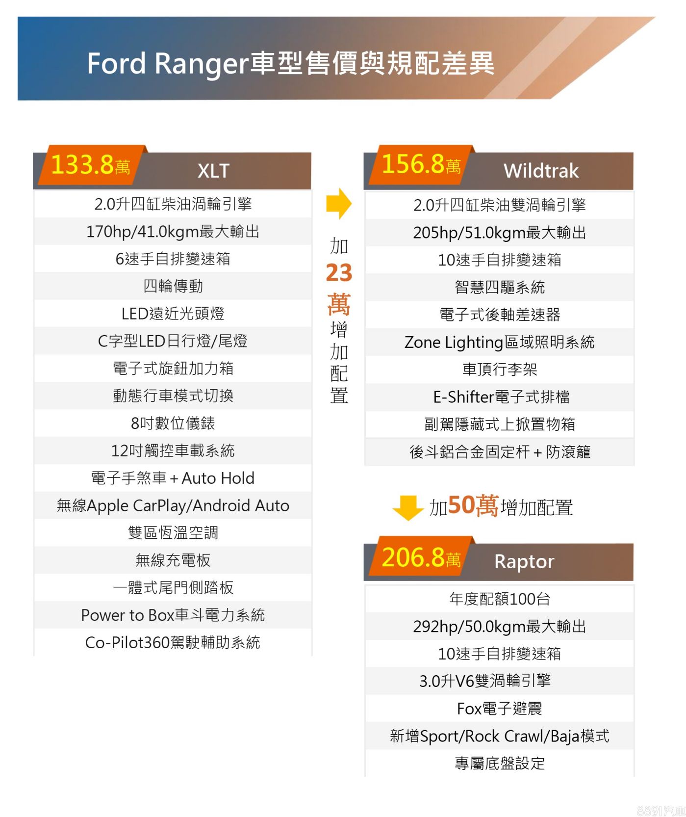 除了標準版車型之外,同步帶來Ranger Raptor性能版本,搭載3.0升V6雙渦輪引擎,可輸出292hp/50.0kgm最大動力,前後懸吊結構皆經強化,也換上Fox電子避震系統,在跳躍、高速越野情況下,可自動調整阻尼至最佳設定,並新增Sport/Rock Craw/Baja三種模式。原廠表示2023配額僅100台,售價206.8萬,在未公開預售情況下已全數售完,未來視情況增加配額。