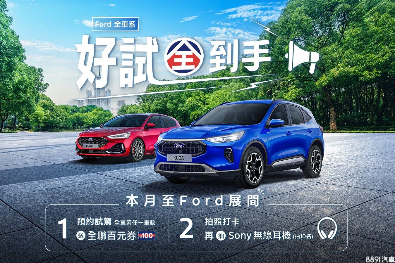 自2025年9月1日起至9月30日止,至全台Ford展示中心試駕任一車款,即可獲得全聯百元購物金,於展示間拍照打卡上傳Ford(TW)官方臉書粉絲團指定貼文,還有機會抽中Sony無線耳機!