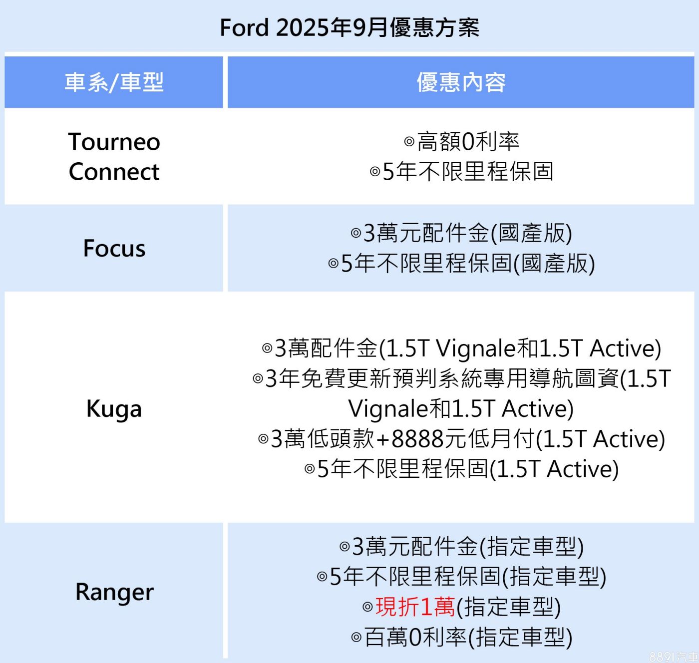 同時原廠也祭出9月優惠,入主Kuga指定車型享3萬元低頭款與低月付8888元,以及5年原廠保固、3萬配件金、3年免費更新預判系統專用導航圖資等。Focus國產車型贈送3萬元配件金及5年原廠保固;Ranger Wildtrak FRS Edition則提供百萬0利率購車優惠,並額外加贈1萬元購車金、3萬元配件金及5年原廠保固;至於Tourneo Connect福特旅玩家享有高額0利率購車優惠及5年原廠保固。