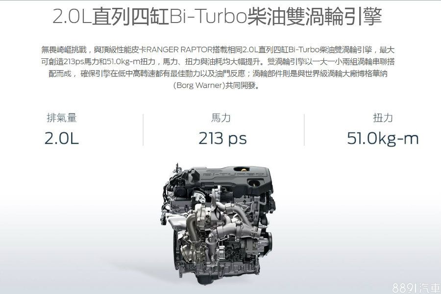 承上述,小改款Ranger一改原款200hp/48kgm的3.2升五缸柴油動力,換上與國外Ranger Raptor同型之2.0柴油四缸雙渦輪心臟,供應著213hp/51kgm最大輸出。變速箱也自原本的六速手自排換為十速新款,原廠並稱新Ranger藉此得以削去1.7秒的0~100km/h加速成績,並改善23%的油耗表現。