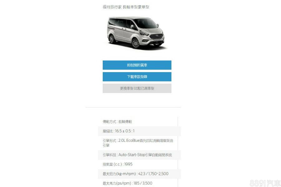 2018年7月在國內發表的小改款Tourneo Custom採長軸尊爵、長軸豪華與短軸豪華共3車型編成,分別開出146.9、165.3、163.3萬之定價,目前官網包含編成、售價都未有改變,但長軸豪華型的輸出進行了調整。