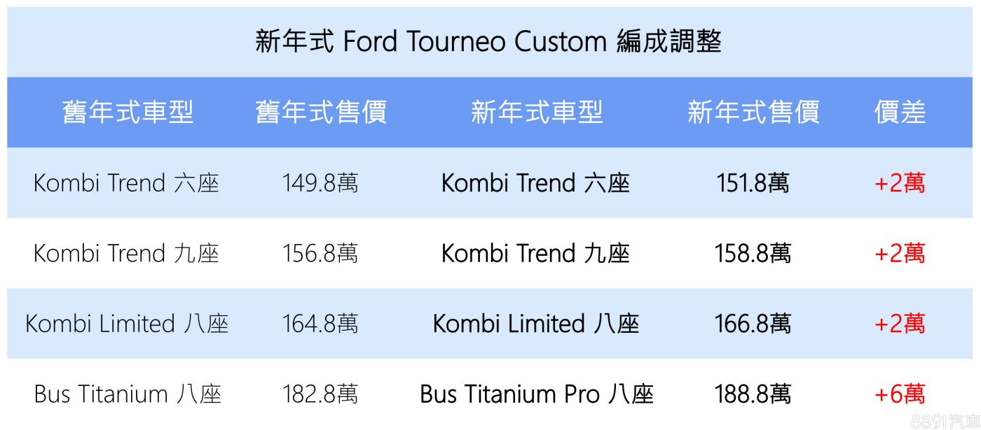 去年10月才剛改款上市的新一代Ford Tourneo Custom,宣布調整國內販售陣容,雖依舊維持四車型編成,但推出「Bus Titanium Pro八座」新車型,取代原頂規「Bus Titanium八座」款,並一舉調漲6萬,要價188.8萬,車系其餘版本則全部迎來2萬漲幅!