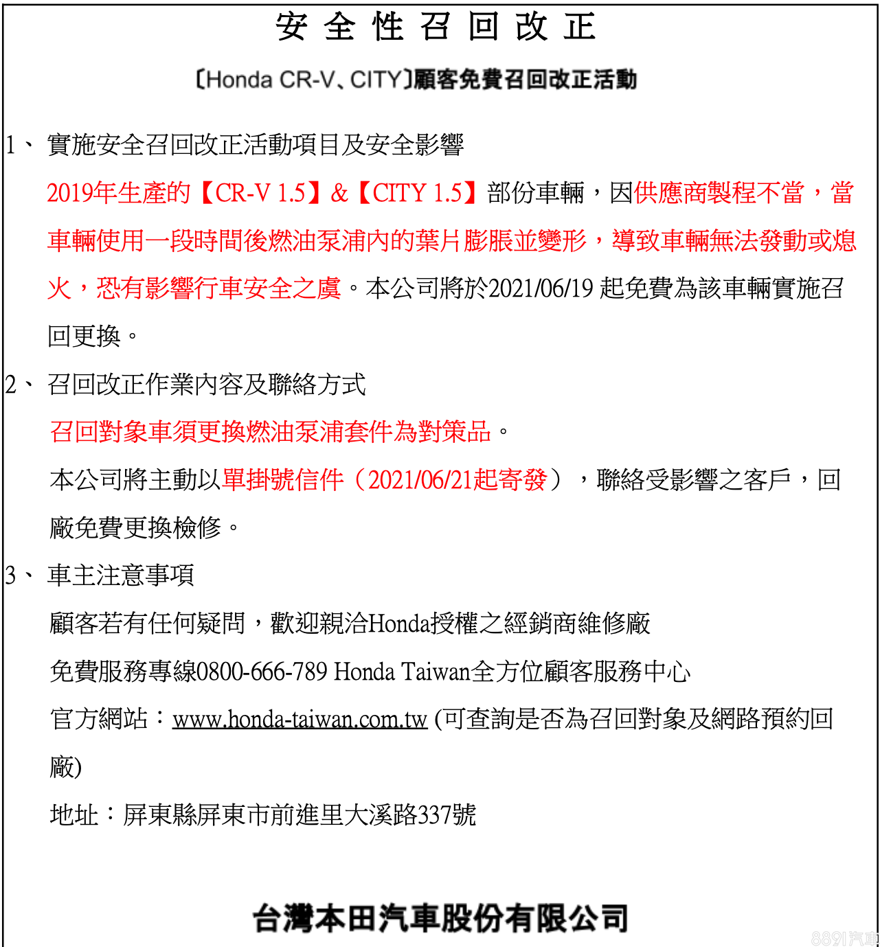 台灣本田對部分CR-V與City發出召回通知,需回廠免費檢修燃油沯浦,以維持行車安全。