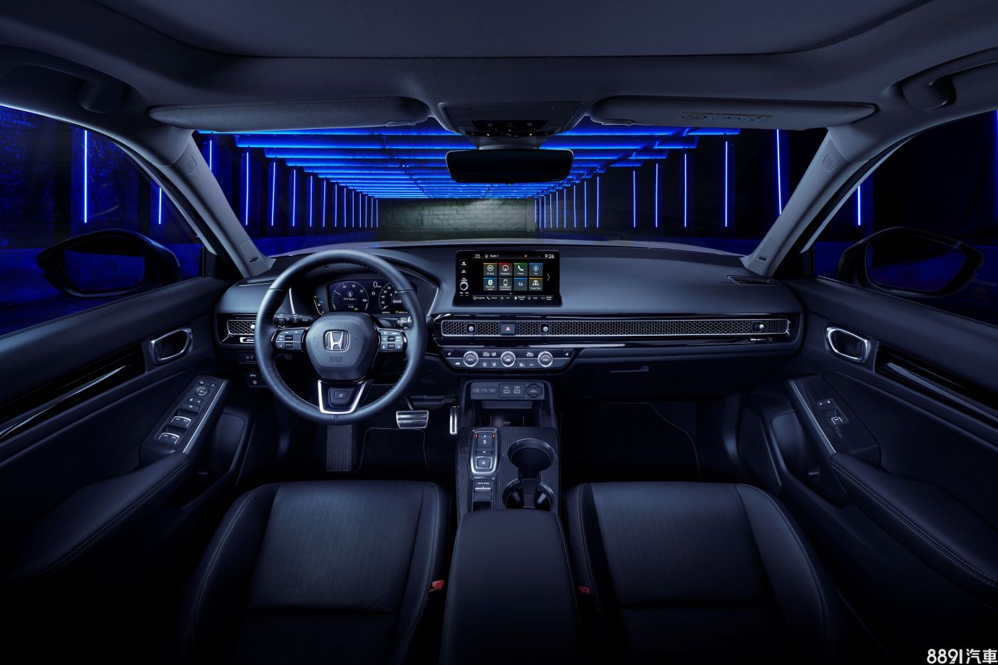 歐規Civic e:HEV內裝維持與美規版相同的格局,水平橫向線條、電子式排檔座,以及大量減少實體按鍵,視覺上十分簡潔,而蜂巢狀的飾板也很搶眼。