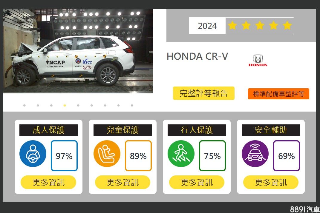 首先本田CR-V是繼國產Nissan X-Trail後,第二款由品牌申請自費送測的車款,報告中顯示,CR-V在成人保護、兒童保護、行人保護、安全輔助等測試項目,分別拿下97%、89%、75%、69%得分比例,獲得五星評價,成功洗刷了TNCAP去年度評測舊款CR-V留下的三顆星難堪紀錄。