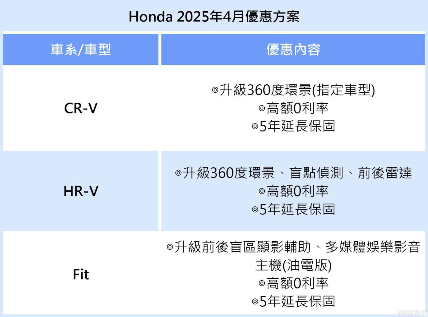 4月只要購買CR-V超極選特仕版,針對S、VTi-S車型,均可升級360度環景;HR-V全車系則均適用特仕版,免費升級360度環景、盲點偵測、前後雷達。