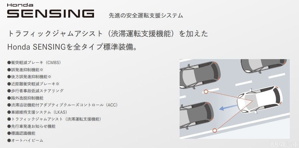 Honda Sensing為全車系標配項目,整合了全速域ACC、LKAS車道維持輔助、交通號誌識別、自動遠光燈、CMBS碰撞緩解煞車、RDM道路偏移抑制、誤踩油門起步抑制、行人碰撞緩解煞車、前車駛離提醒等系統,小改款為ACC追加了TJA交通壅塞輔助功能,盲點偵測則為高階版本始標配。