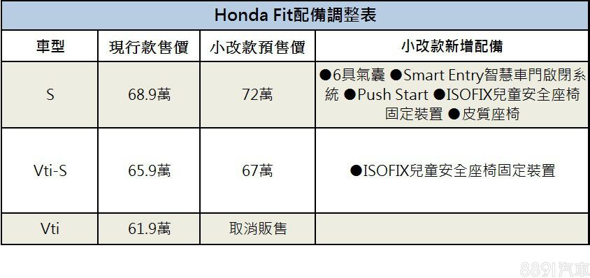 根據原廠資訊,小改款Fit提供VTi-S與S兩種版本販售,並取消了原本的VTi版本,VTi-S的預售價67萬元,S版預售價為72萬元。