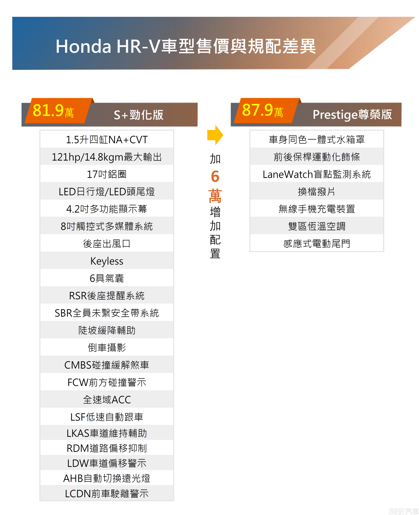 大改款HR-V國內首波僅供單一汽油動力,規劃有S+勁化版與Prestige尊榮版,正式售價依序為81.9萬與87.9萬,據了解目前為止已接單突破2200張,並將於6月18日全國Honda Cars據點上市。