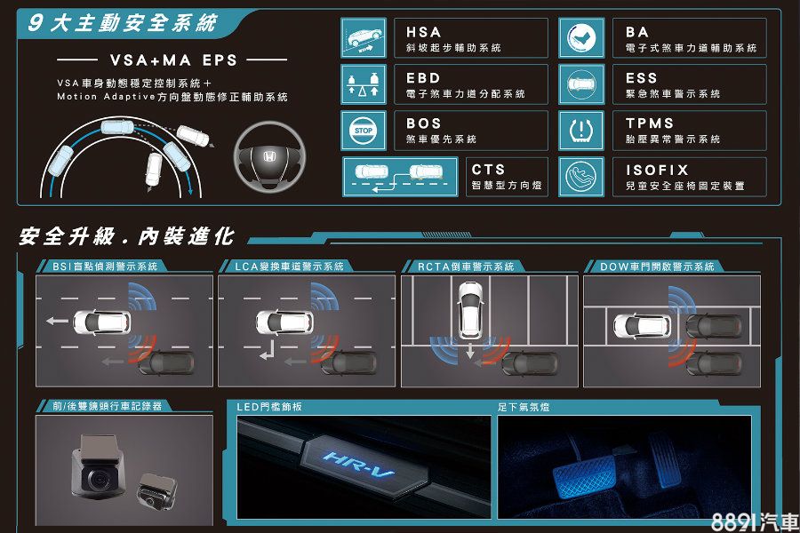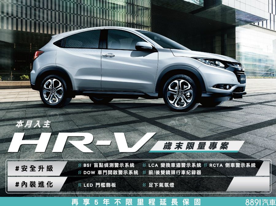Honda本月推出全新「HR-V歲末限量專案」,除標配九大主動安全系統,現在入主新車再免費升級「前/後雙鏡頭行車記錄器」、「BSI盲點偵測警示」、「LCA變換車道警示」、「RCTA倒車警示」以及「DOW車門開啟警示」等安全科技,另外還新增門檻飾板、足下氣氛燈等部件,加上政府「貨物稅定額減徵新台幣5萬元」,優惠總價值達9萬元。