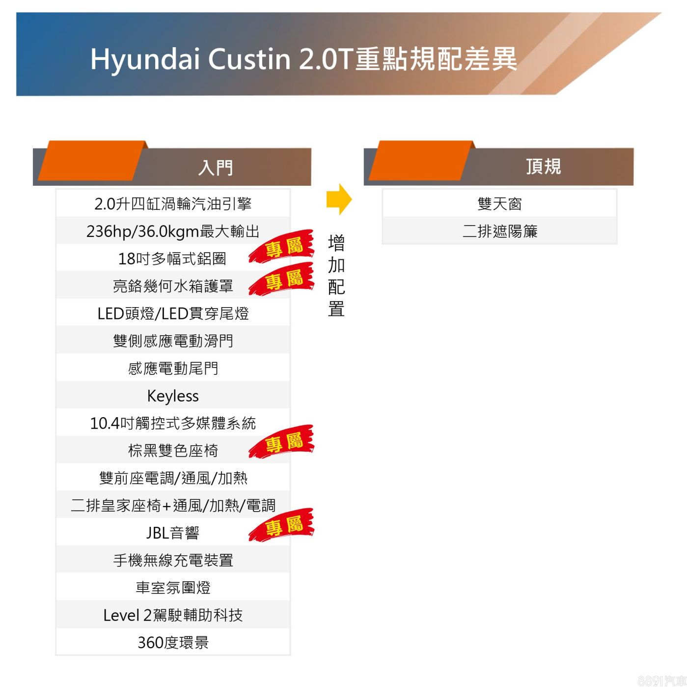 Custin 2.0T新增不少專屬配備,像是18吋多幅式鋁圈、亮鉻幾何水箱護罩、棕黑雙色座椅及JBL音響,此外也會追加「珍珠黑」與「隕石灰」的限定車色,藉此來與1.5T車型做出區隔。