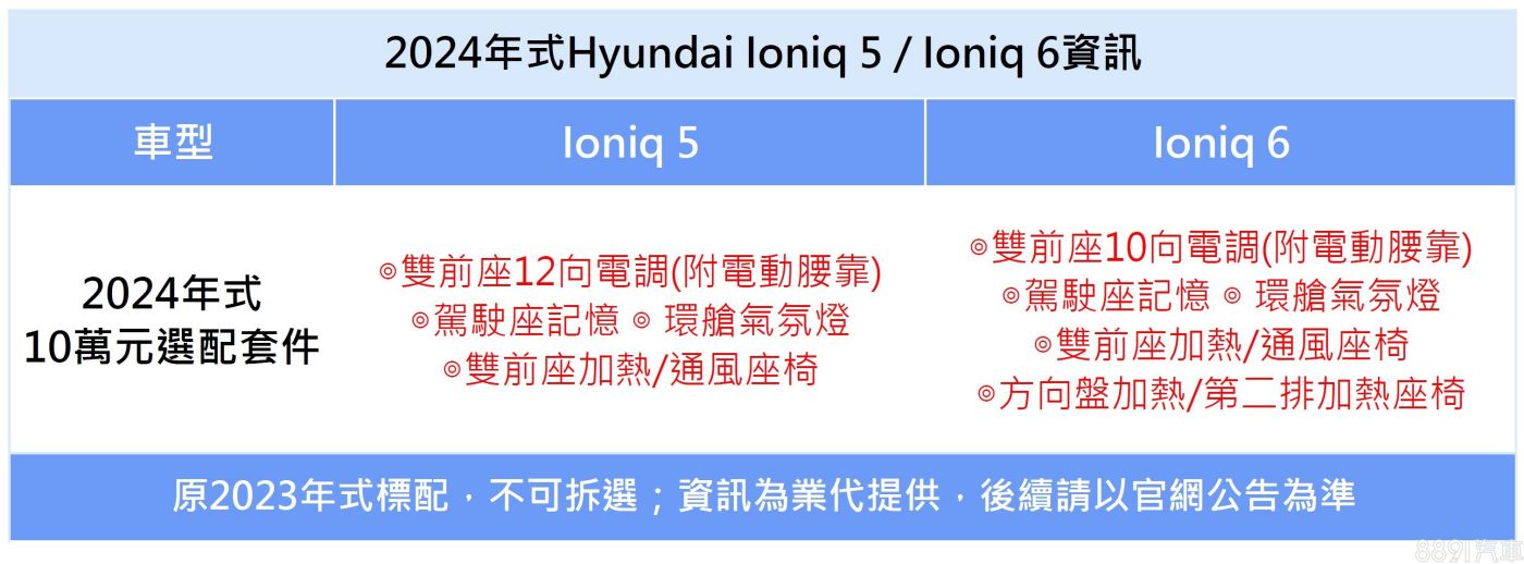 據銷售端提供資訊,2024年式Ioniq 5與Ioniq 6,暫時不提供EV400入門動力,將視現售款出清狀況調整上市時間,目前預計7月後可交車。此外,新年式車型將規劃一組10萬元的套件,據說是將現有多向電調座椅、駕駛座記憶、雙前座通風/加熱、環艙氣氛燈等配備改為選配,讓車主可依個人需求加選。