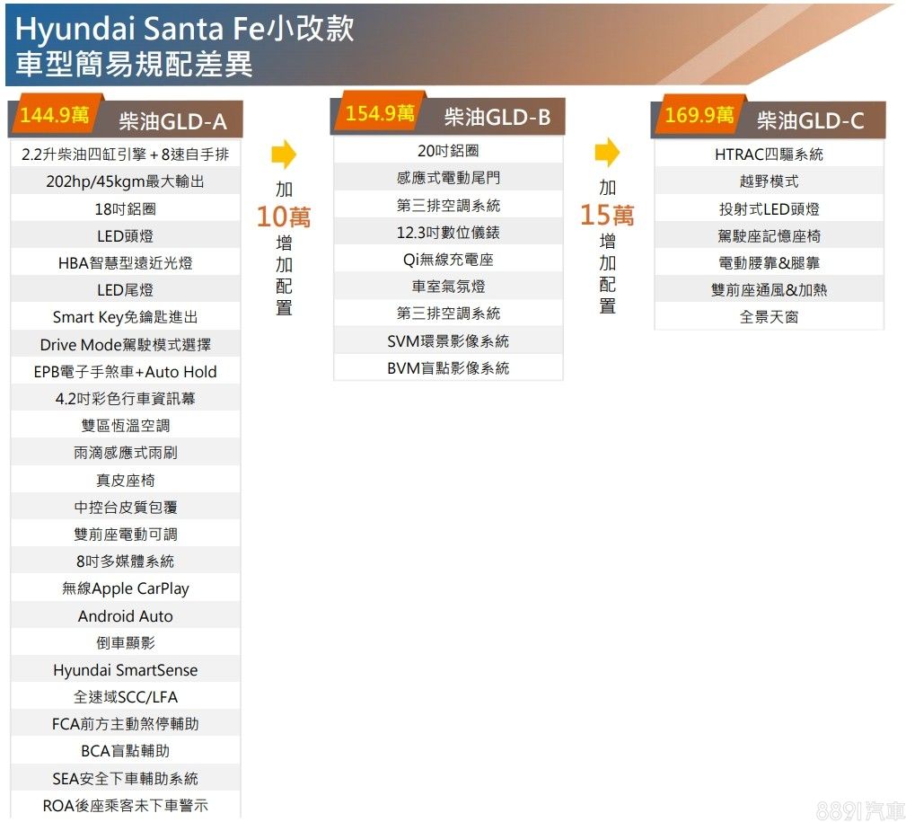 小改款Santa Fe取消原有2.4升汽油NA引擎,提供柴油、油電兩種動力供選擇,配備編成各自提供三種車型,價格帶皆落在145萬到170萬區間,唯油電版目前僅是預接單價,預計年底前公布正式售價。可以看出Hyundai總代理南陽實業企圖透過配備調整降低油電版本入手門檻,入門款油電唯一搭載織布座椅、取消盲點偵測輔助,頂規油電配備水準則與中階柴油版相仿。至於頂規柴油版則唯一具備四驅系統與越野模式選擇,也提供雙前座通風加熱、全景天窗等豪華配備。
